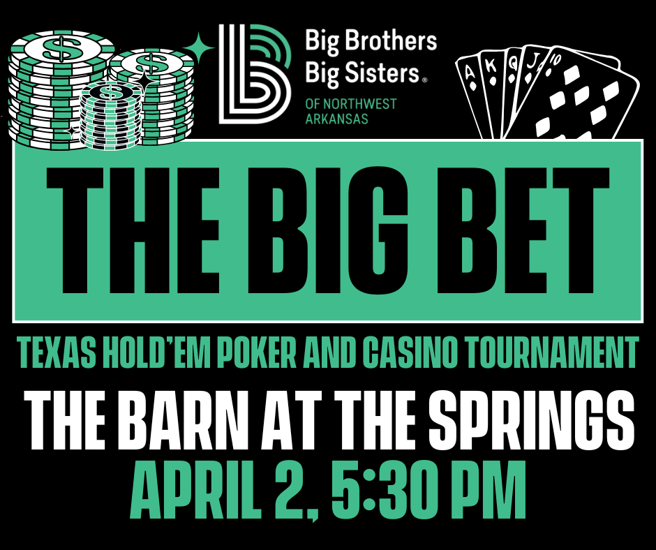 The Big Bet is a Texas Hold’em style poker tournament and casino night to raise money for youth mentorship in Northwest Arkansas. This event will be an exciting night of gameplay that includes food, beer, and wine.